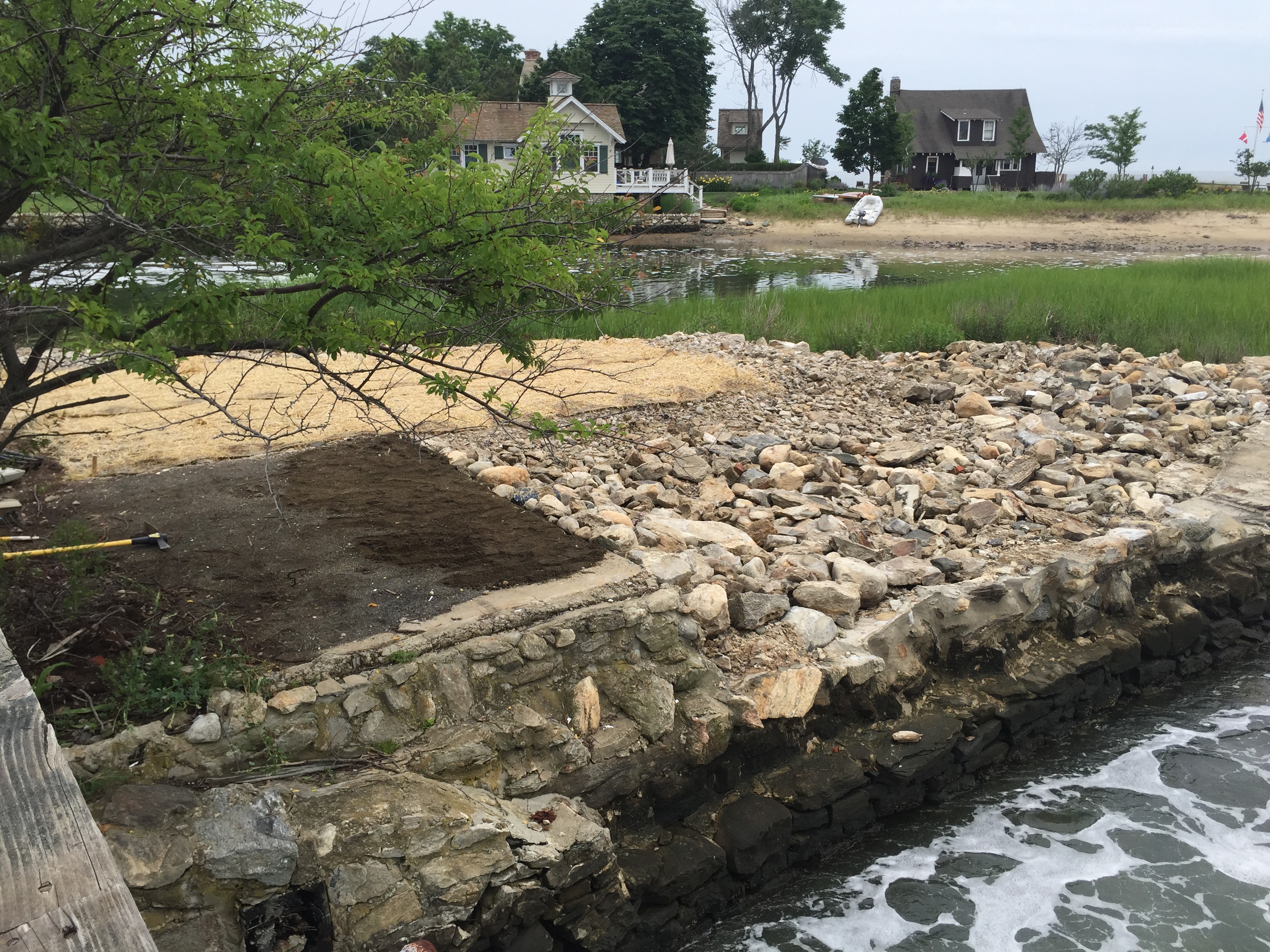A pair of summer cottages was built on a small marsh island in the narrow channel between Sherwood Millpond and Compo Cove, in Westport, CT. Construction involved filling of tidal wetlands to raise the ground level, as well as armoring the shoreline with boulders and seawalls
